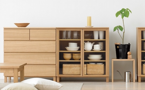 走進無印,可發現琳瑯滿目滿滿的收納商品,入手幾個收納箱將生活雜物、家電用品通通收進去,在藏在一片磨砂玻璃門之後,關起門來不再雜亂無章。若是在牆面想要有一大片的收納空間,也可以製作白色或原木色的系統櫃,則有更多收藏空間。這種簡潔有力的收納方式是極簡的一大重要元素,少即是多,越簡化越好。