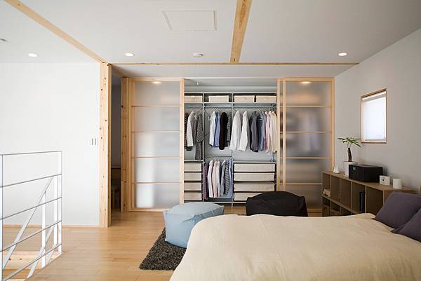 傳統的水泥隔間容易使視覺無法延伸、空間看起來變的狹隘許多,因此在小坪數的空間設計上,盡量去除隔間能創造通透感。無印在隔間的處理上也是如此,不做太多封閉的隔間,運用高櫃隔開更衣間與臥室兩個範圍,想改變時不用再花大筆錢改變隔間,留下了更多空間,也多了許多彈性!