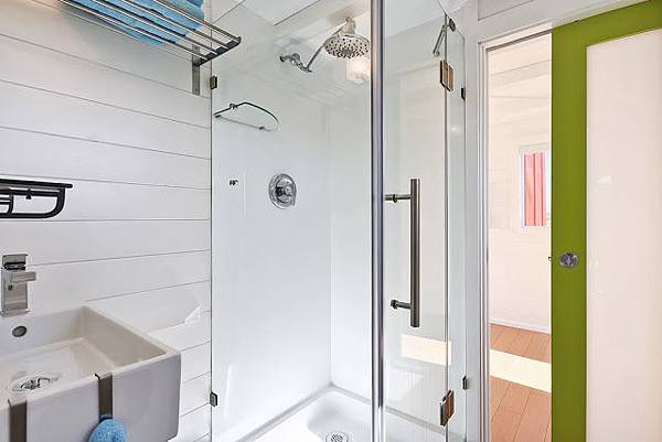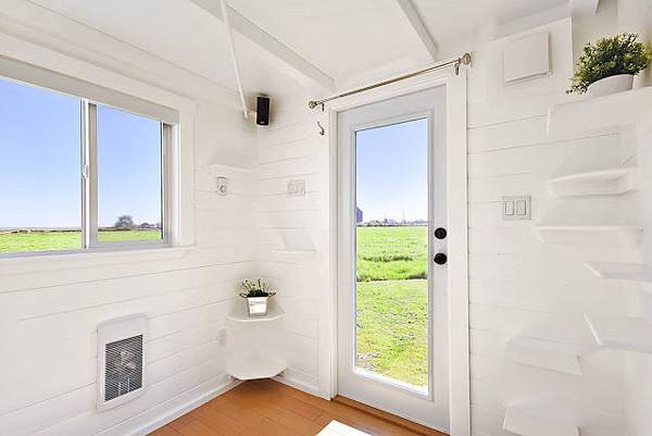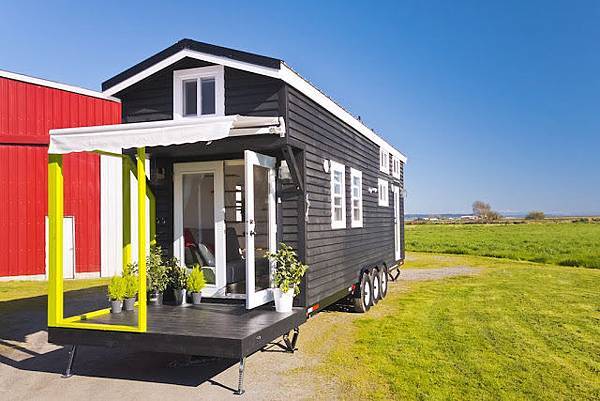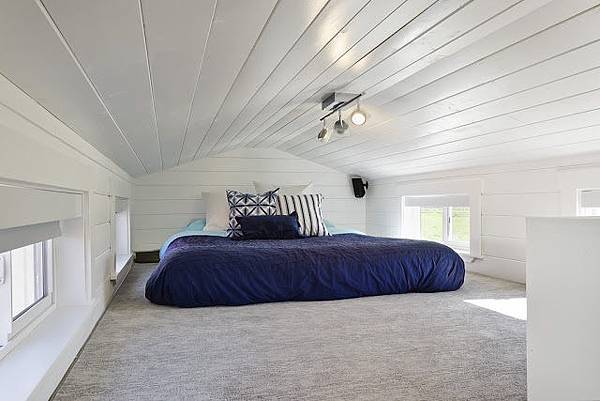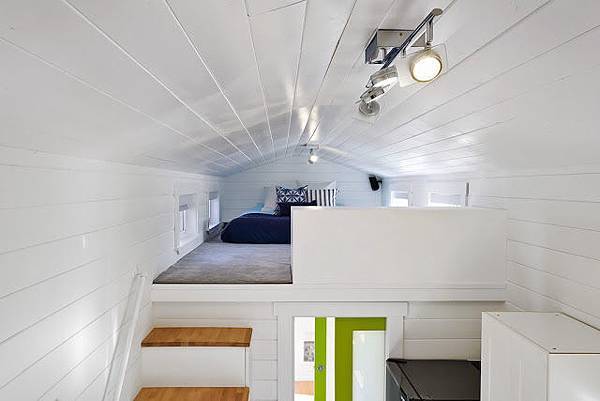 這個英國的 tiny house好似露營車一般,裝上可愛的輪胎,在裡面打造出可以簡單生活的起居空間。可別小看這樣的空間喔!就像魔術師從帽裡拉出永遠剪不斷的緞帶一般,屋裡面可是規劃有客廳、廚房、浴室兼洗衣房、用餐空間樣樣不缺,另外善加利用頂端空間,在兩側分別納入小閣樓(變成了溫馨臥室)。